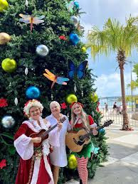 ビーチのすぐ近くに大きなクリスマスツリーがデコレーションされている様子が